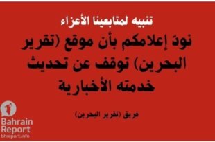 تنبيه لمتابعينا الأعزاء..نودّ إعلامكم بأن موقع (تقرير البحرين) توقف عن تحديث خدمته الأخبارية لأسباب إدارية بحتة لا علاقة لها بالمحتوى أو الخدمات المقدمة. وسنعود بكامل نشاطنا في أقرب وقت. فريق (تقرير البحرين)