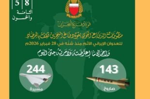 تقرير البحرين/المنامة/ أعلنت القيادة العامة لقوة دفاع البحرين أن منظومات الدفاع الجوي بقوة دفاع البحرين بفضلٍ من الله، ثم بيقظة رجالها مستمرة في مواجهة موجات تتابعية من الاعتداءات الإيرانية الإرهابية الآثمة حيث تم منذ بدء الاعتداء الغاشم اعتراض وتدمير 143 صاروخ و 244 طائرة مسيرة، استهدفت مملكة البحرين. وأكدت القيادة …