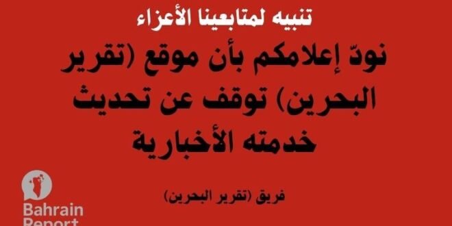 تنبيه لمتابعينا الأعزاء..نودّ إعلامكم بأن موقع (تقرير البحرين) توقف عن تحديث خدمته الأخبارية لأسباب إدارية بحتة لا علاقة لها بالمحتوى أو الخدمات المقدمة.